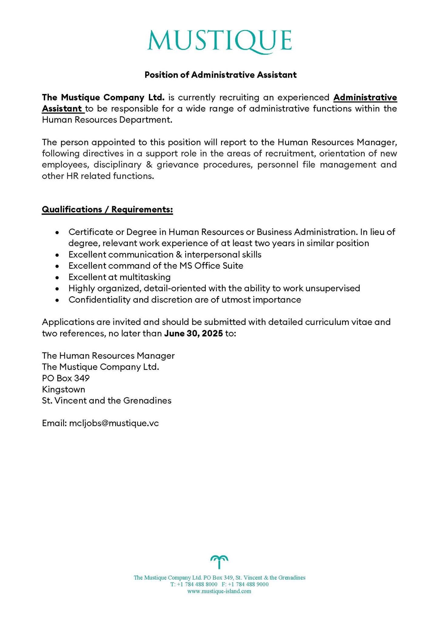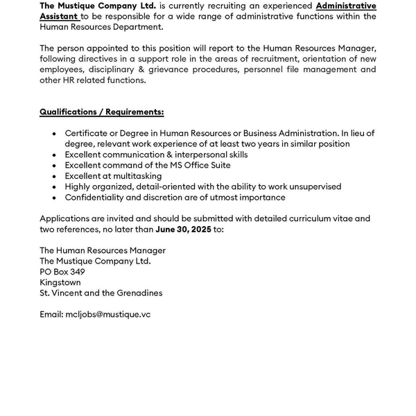Mustique company seeks administrative assistant