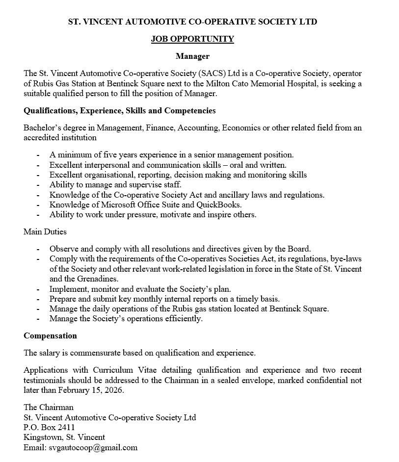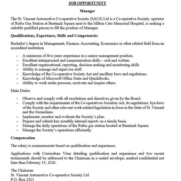 The St. Vincent Automotive Co-operative Society (SACS) Ltd is a Co-operative Society, operator of Rubis Gas Station at Bentinck Square next to the Milton Cato Memorial Hospital, is seeking a suitable qualified person to fill the position of Manager.