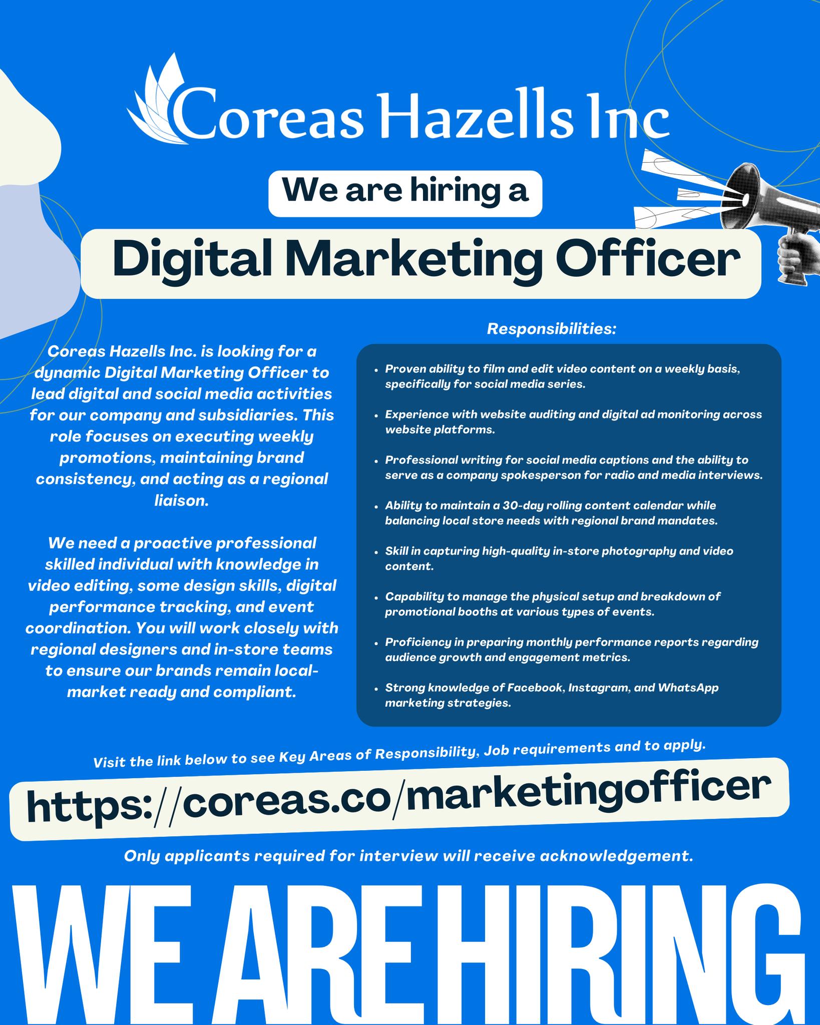 Coreas Hazells Inc seeks Digital Marketing Officer