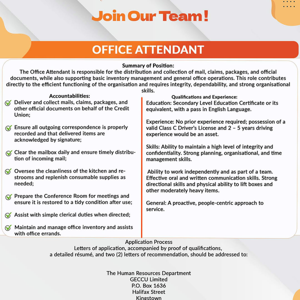 The Office Attendant is responsible for the distribution and collection of mail, claims, packages, and official documents, while also supporting basic inventory management and general office operations. This role contributes directly to the efficient functioning of the organisation and requires integrity, dependability, and strong organisational skills.