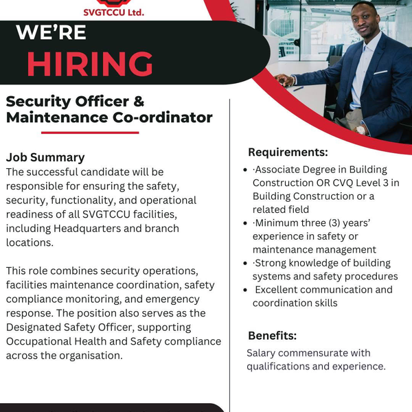 The St. Vincent and the Grenadines Teachers Co-operative Credit Union Ltd. (SVGTCCU) invites applications from suitably qualified persons for the position of Security Officer & Maintenance Co-ordinator.