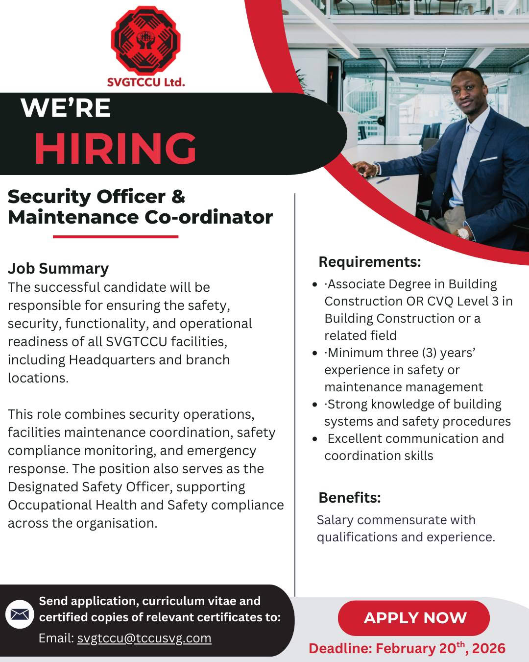 Interested candidates are invited to submit their application, curriculum vitae and certified copies of relevant certificates to svgtccu@tccusvg.com by February 20, 2026