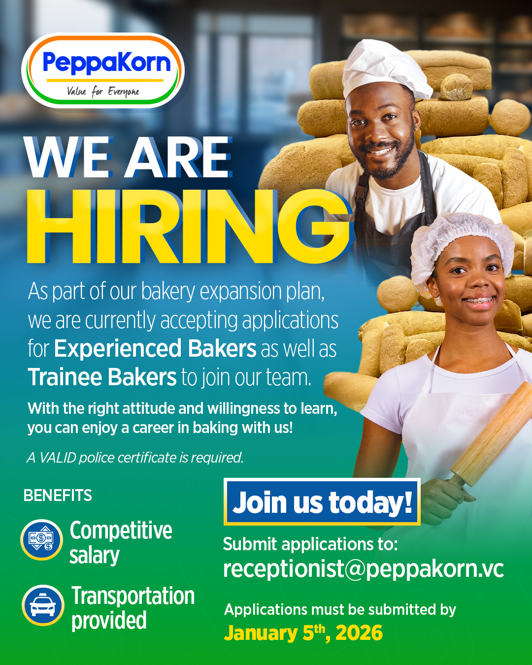 As part of its bakery expansion plan, PeppaKorn is seeking Experienced Bakers to join its team. The company offers a career in baking for individuals with the right attitude and willingness to work in a growing bakery environment.